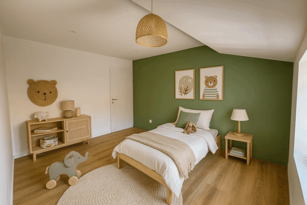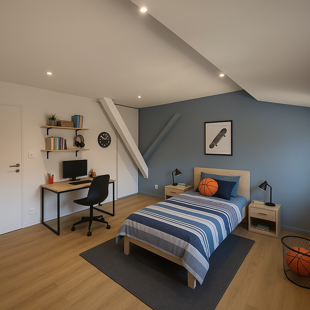 RDC : vaste double garage avec porte motorisée, espace pour vélos/motos, rangements et coin atelier. Une pièce annexe au même niveau peut servir de bureau, salle de jeux ou chambre d’appoint- complété par une buanderie.