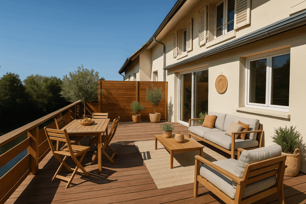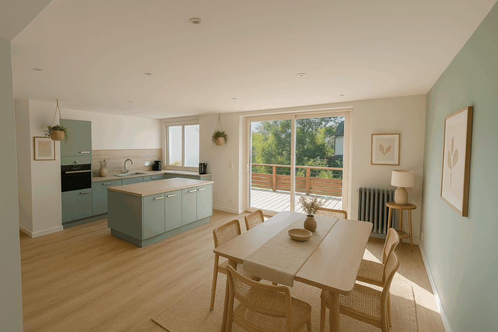 1er étage : grande pièce de vie très lumineuse ouvrant sur une terrasse suspendue d’environ 50 m² avec vue dégagée sur un environnement vert en bord d’eau — idéale pour les repas d’été. Cuisine contemporaine aménagée et fonctionnelle. Une chambre, une salle de bains et un WC complètent ce niveau.